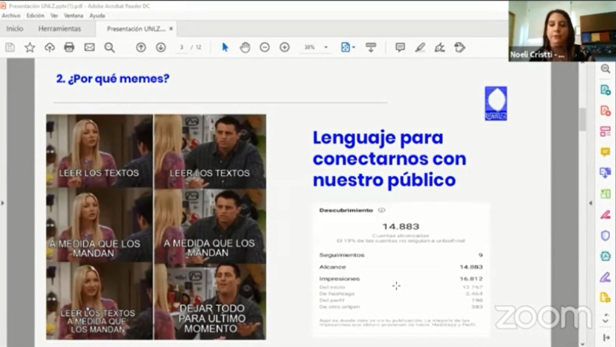 Concluída la exposición, cuatro universidades nacionales relataron sus experiencias en los cambios y organización comunicacional a partir del ASPO. Noelí Cristti, integrante de la Secretaría de Coordinación Institucional de la UNLZ, desarrolló la importancia del lenguaje común para la comunidad de nuestra universidad, con el objetivo no sólo de “seguir informando, sino también formando comunidad”.