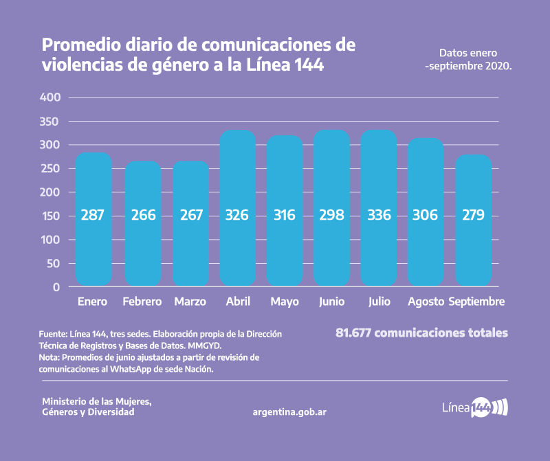 Según un informe del Ministerio de las Mujeres, Géneros y Diversidad, relevado a partir de los llamados al 144 -línea gratuita para denuncias y contención de violencia de género- este año hubo un promedio de 300 llamadas por día, donde casi la totalidad de las personas refirieron sufrir violencia psicológica por parte de su agresor. Este número alarmante va de la mano del promedio de femicidios ocurridos en 2020: 265 desde 1 de enero y el 20 de noviembre de 2020. Este último dato, relevado por el Observatorio “Ahora que sí nos ven”, destaca que el 63,8% de los femicidios fueron cometidos por las parejas o ex parejas de las víctimas y que el 64,5% de los femicidios ocurrió en la vivienda de la víctima.