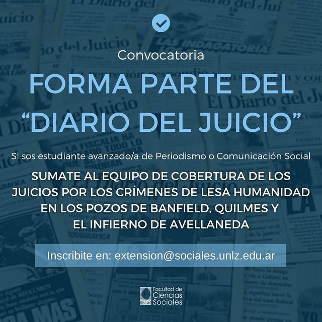 La Facultad de Ciencias Sociales de la Universidad Nacional de Lomas de Zamora convoca a estudiantes avanzados/as de Comunicación y Periodismo a participar del Diario del Juicio, la cobertura de Juicios por delitos de lesa humanidad en Argentina, vinculados al Pozo de Banfield, Quilmes y al Infierno de Avellaneda. Desde la Secretaría de Extensión de la Facultad aseguraron que, con las crónicas que salen de la cobertura, “estamos recuperando las historias de esas personas”.