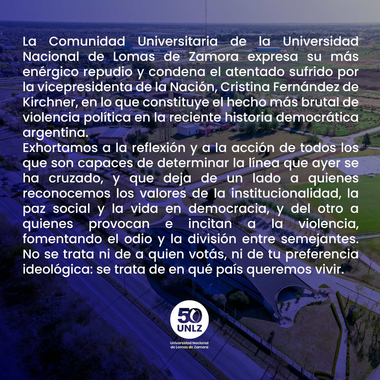La Comunidad Universitaria de la Universidad Nacional de Lomas de Zamora expresa su más enérgico repudio y condena el atentado sufrido por la vicepresidenta de la Nación, Cristina Fernández de Kirchner, en lo que constituye el hecho más brutal de violencia política en la reciente historia democrática argentina.