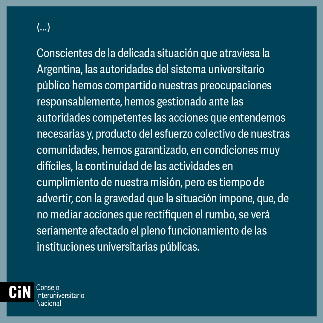 Conscientes de la delicada situación que atraviesa la Argentina, las autoridades del sistema universitario público hemos compartido nuestras preocupaciones responsablemente, hemos gestionado ante las autoridades competentes las acciones que entendemos necesarias y, producto del esfuerzo colectivo de nuestras comunidades, hemos garantizado, en condiciones muy difíciles, la continuidad de las actividades en cumplimiento de nuestra misión, pero es tiempo de advertir, con la gravedad que la situación impone, que, de no mediar acciones que rectifiquen el rumbo, se verá seriamente afectado el pleno funcionamiento de las instituciones universitarias públicas.