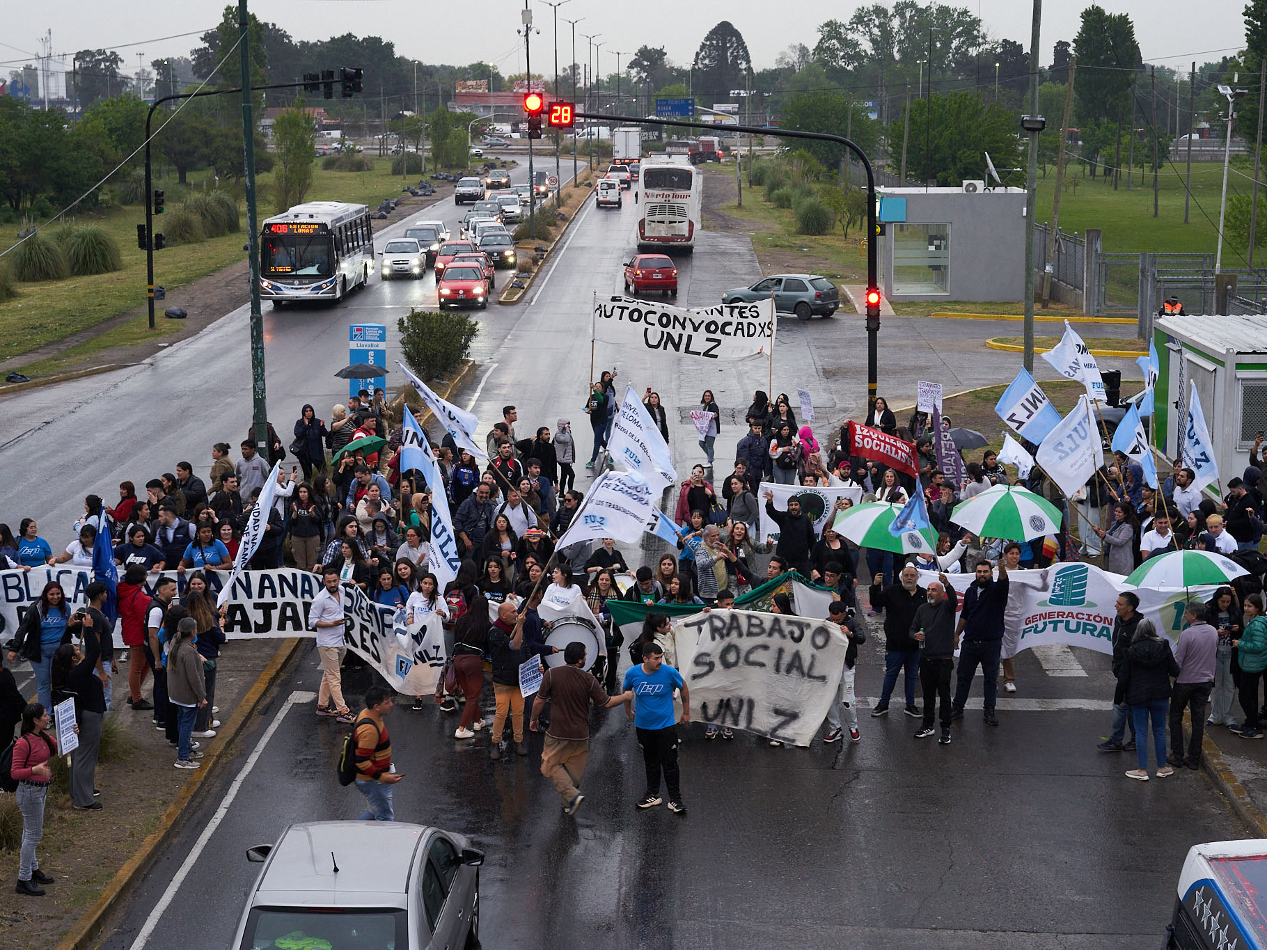 Con una lluvia constante y cada vez más copiosa, la comunidad universitaria se manifestó con un ruidazo en Juan XXIII donde repartieron volantes a los autos que pasaban, los cuales respondían con bocinazos en apoyo al reclamo universitario.