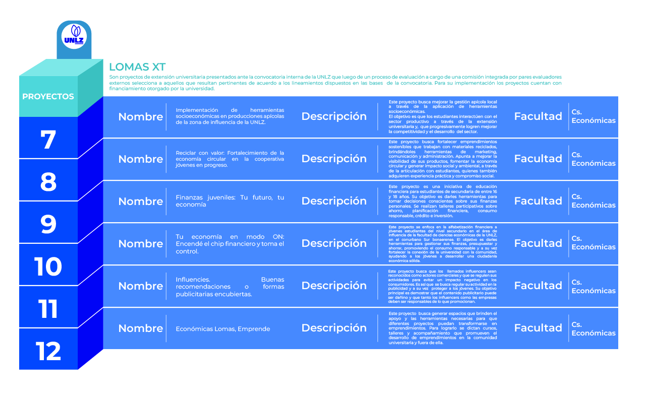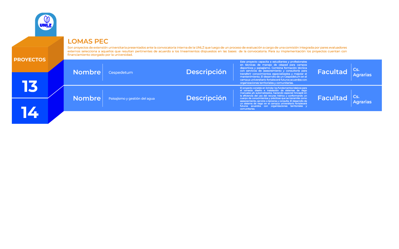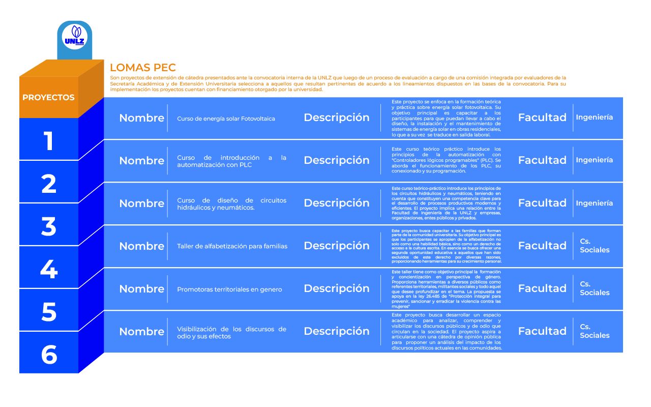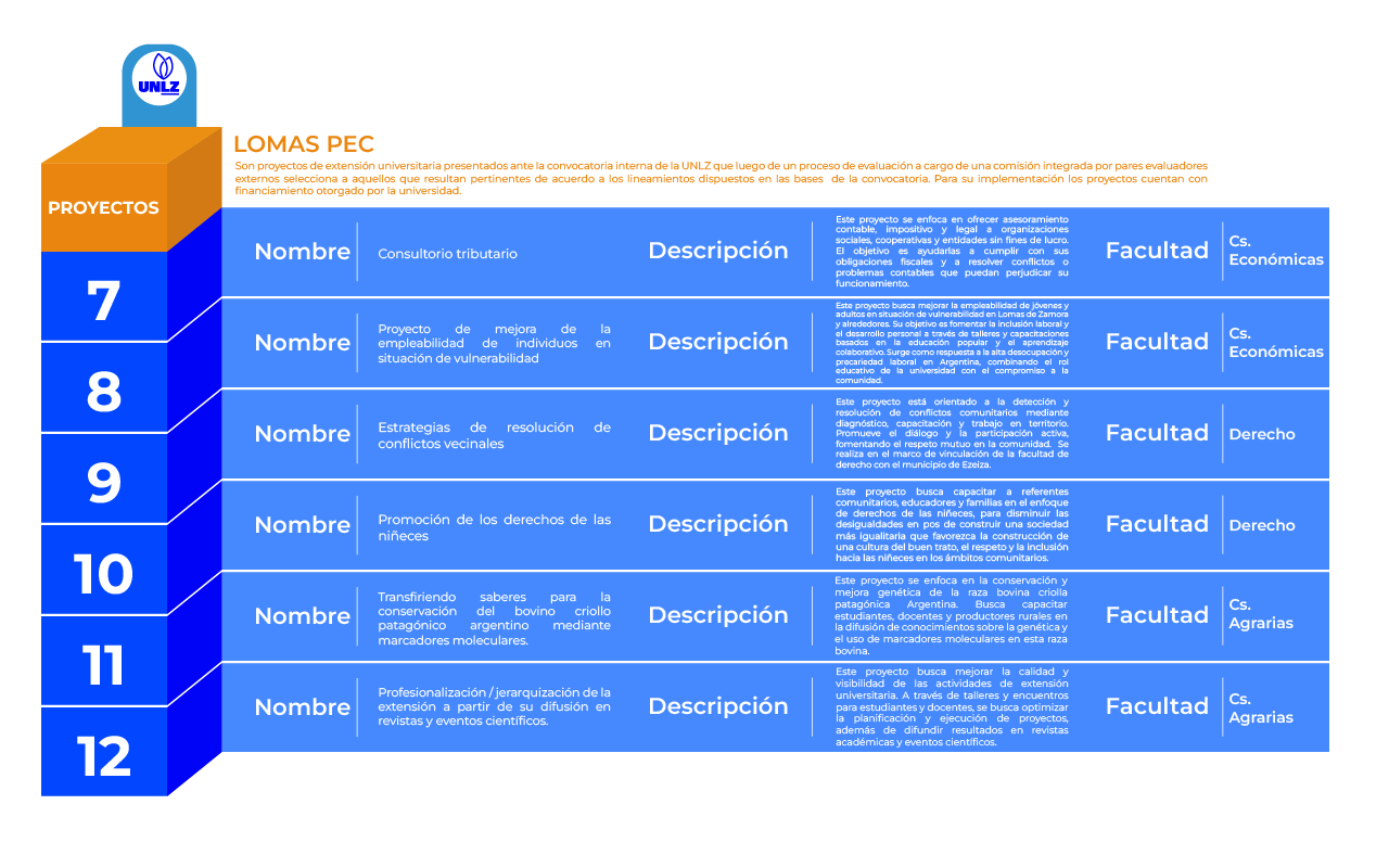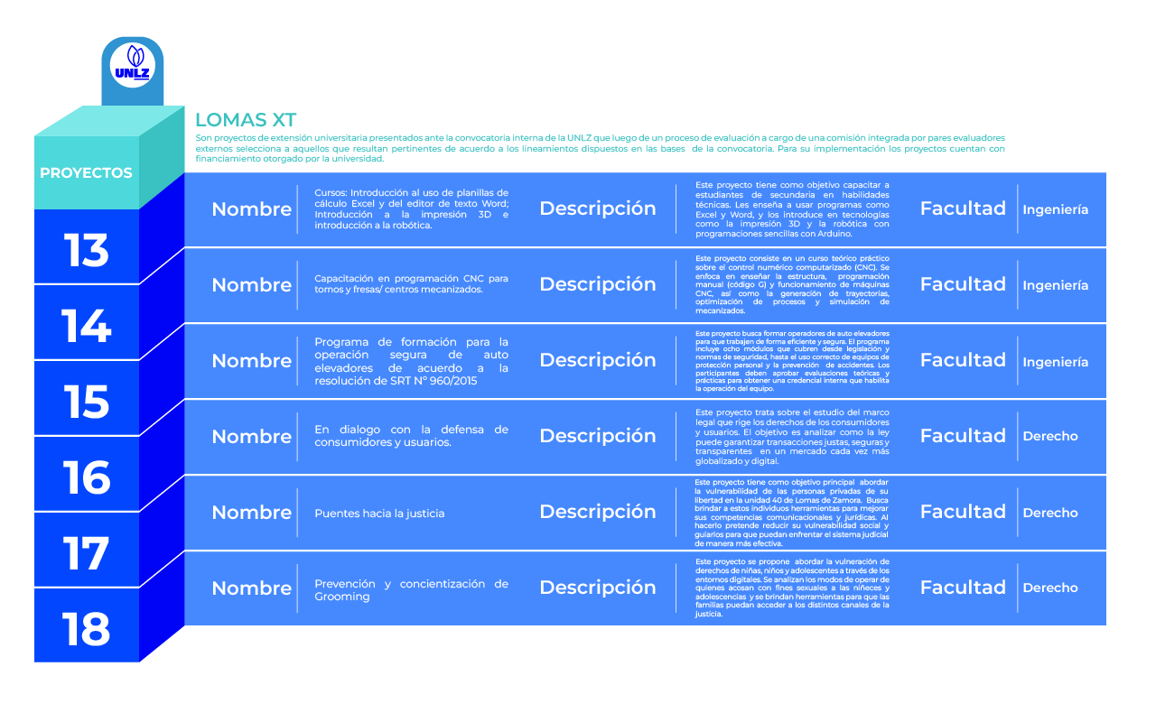 Son proyectos de extensión universitaria presentados ante la convocatoria interna de la UNLZ que luego de un proceso de evaluación a cargo de una comisión integrada por pares evaluadores externos selecciona a aquellos que resultan pertinentes de acuerdo a los lineamientos dispuestos en las bases de la convocatoria. Para su implementación los proyectos cuentan con financiamiento otorgado por la universidad.